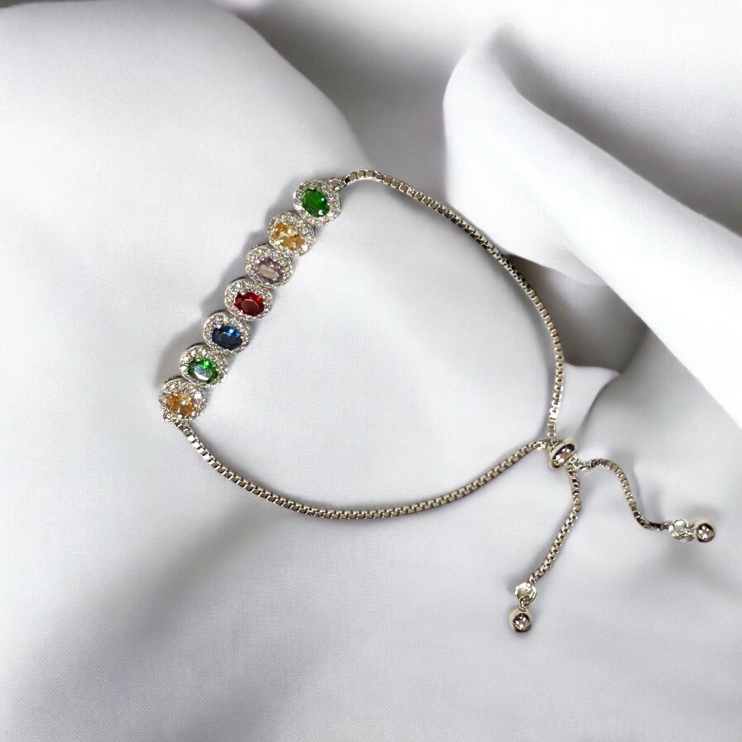 CompareA vibrant sterling silver bracelet finished with rhodium plating, featuring a row of brilliant multicolored center stones framed by sparkling pavé accents. The lively combination of colors adds a playful elegance, while the sleek adjustable slider closure ensures a comfortable and modern fit.