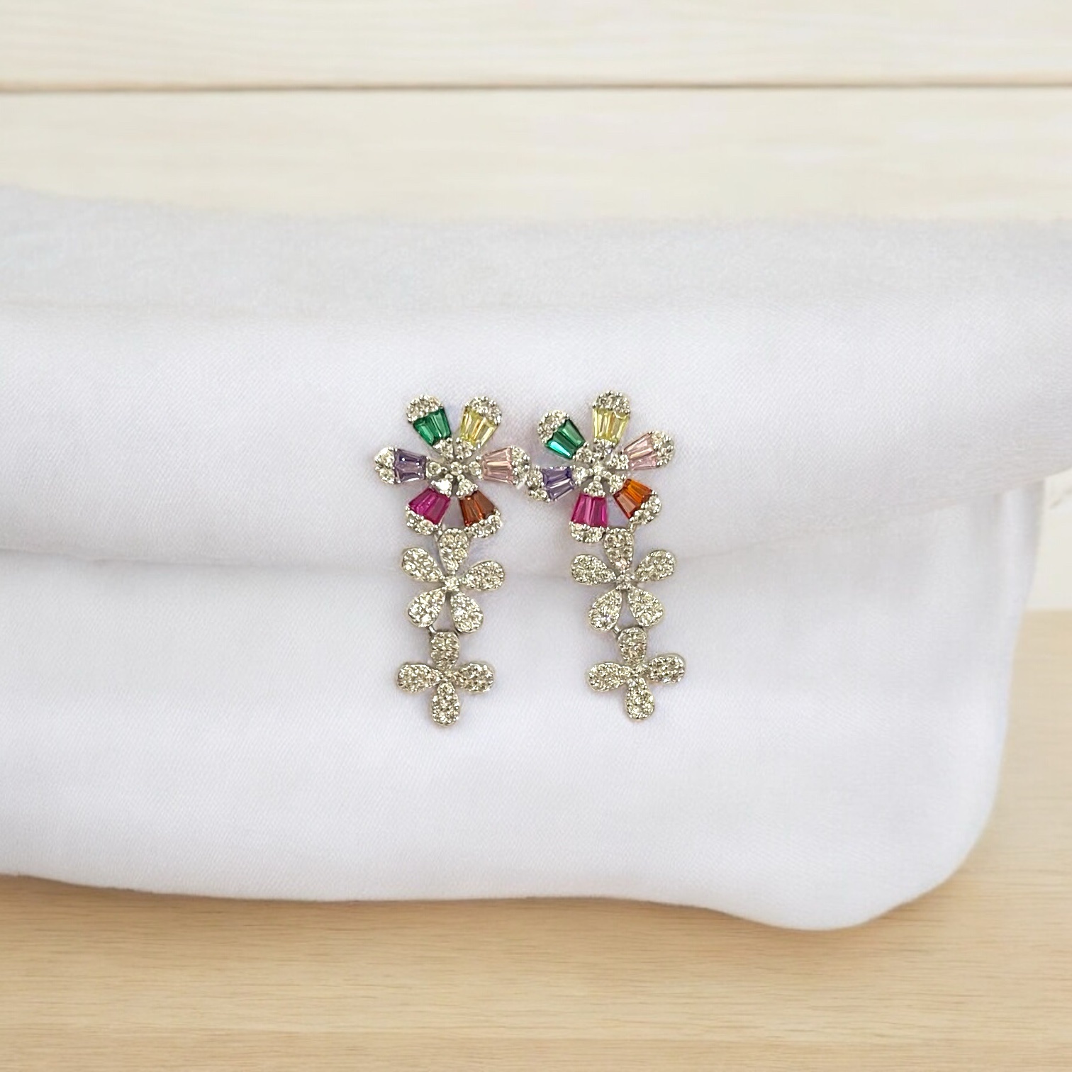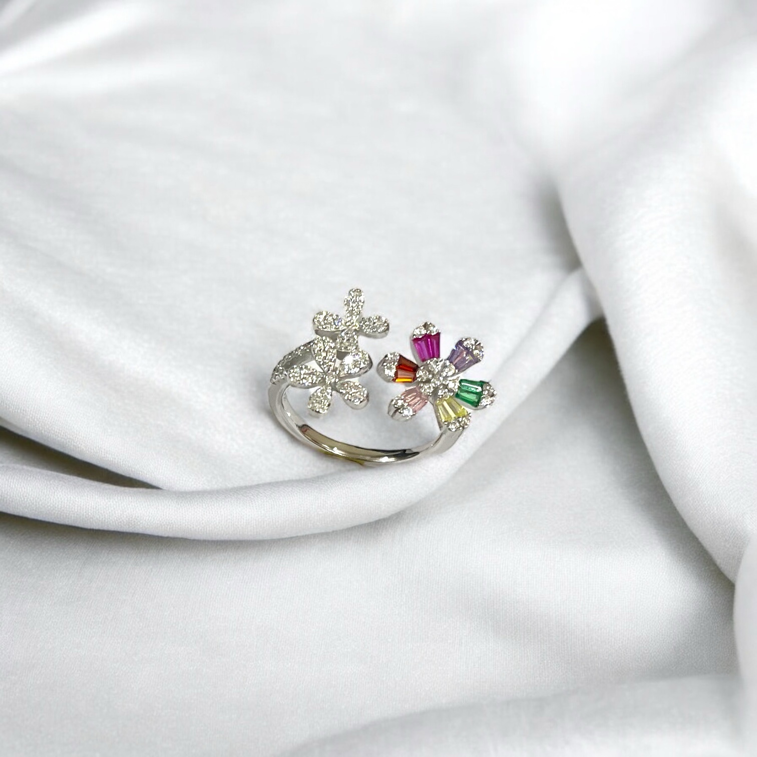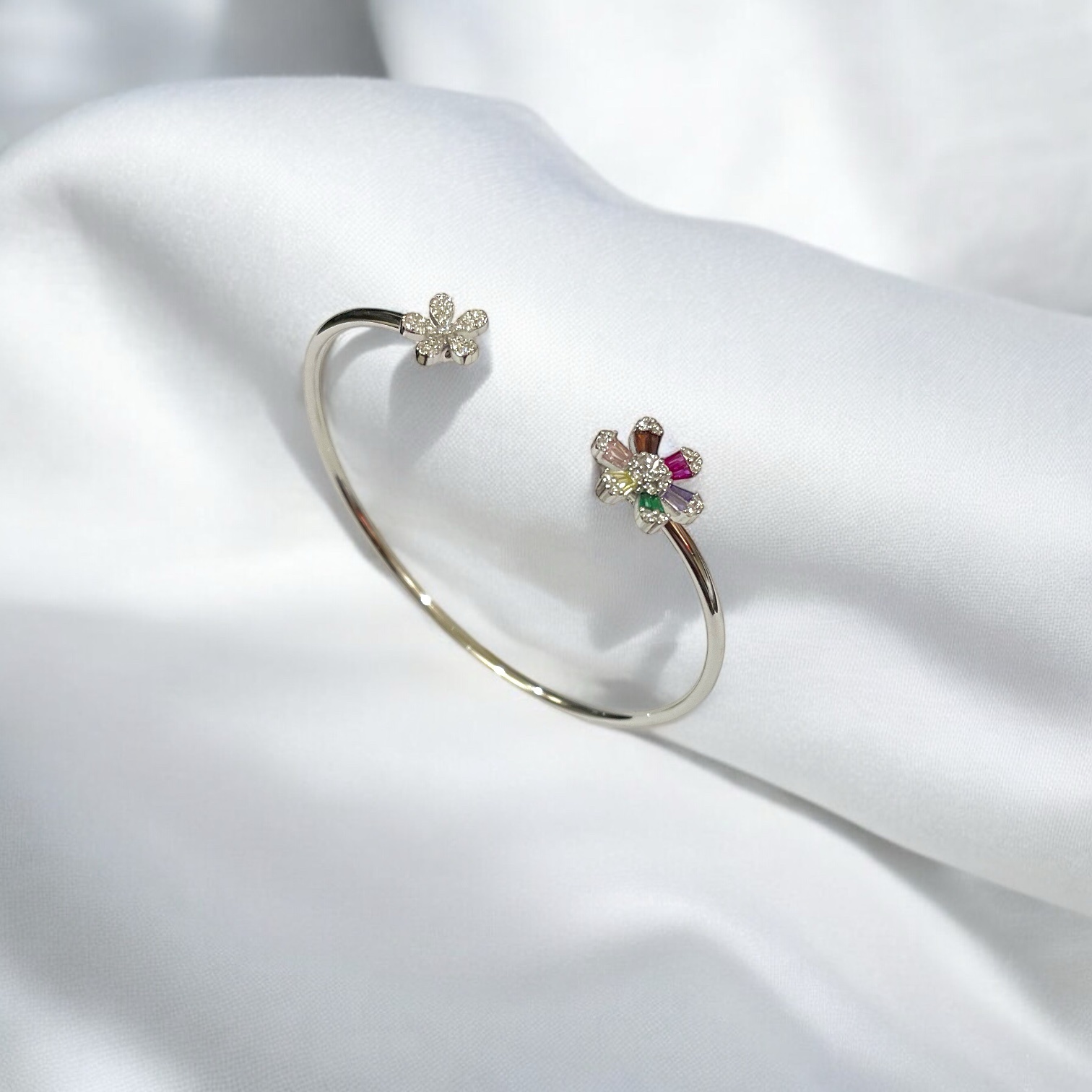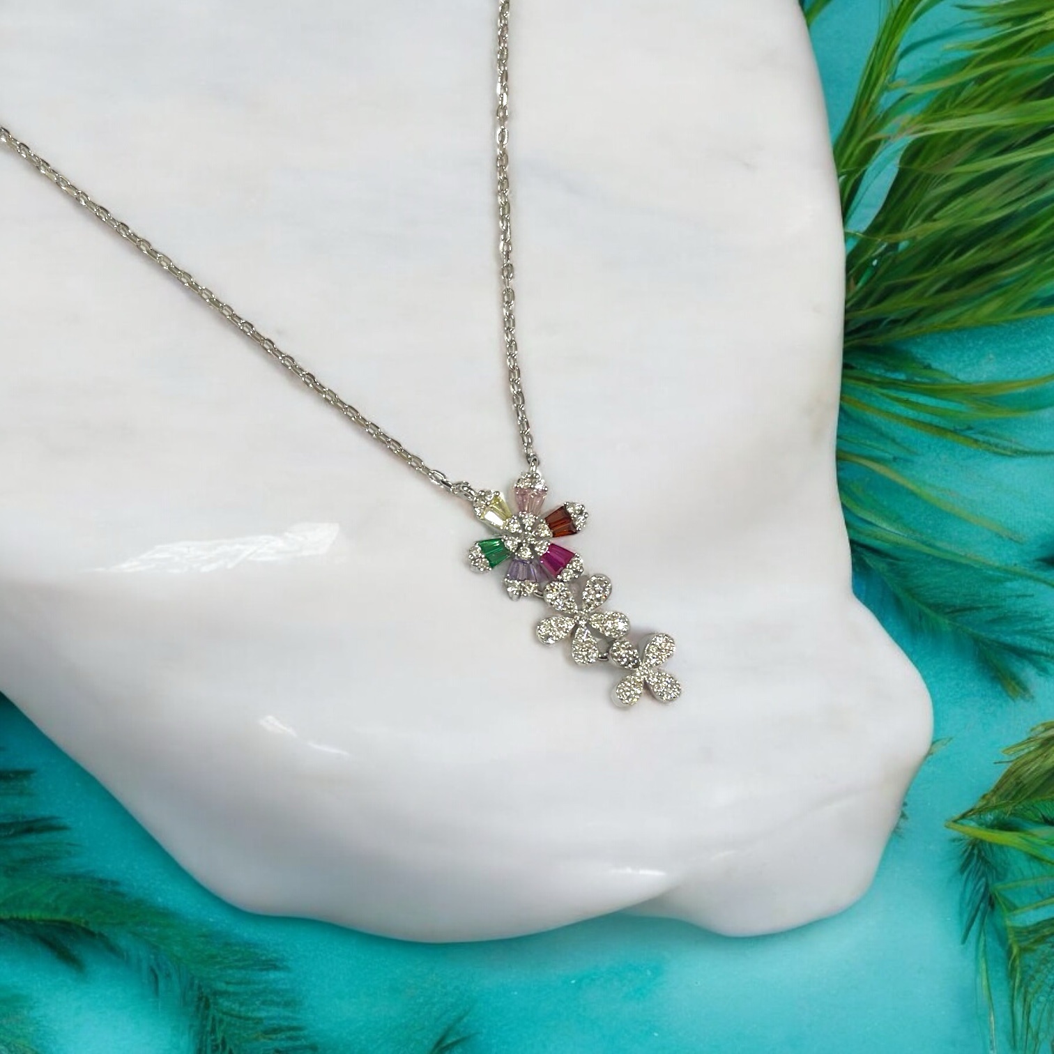 Delicate yet vibrant, the Blossom Radiance Sterling Silver Pendant Set brings the beauty of nature into timeless jewelry. Crafted in sterling silver with a rhodium-plated finish, the set features a graceful floral design adorned with sparkling white stones and multi-colored accents that add a lively pop of color. The pendant necklace, matching earrings, ring, and open bangle come together in perfect harmony, making this set a radiant choice for festive occasions, celebrations, and elegant everyday wear.