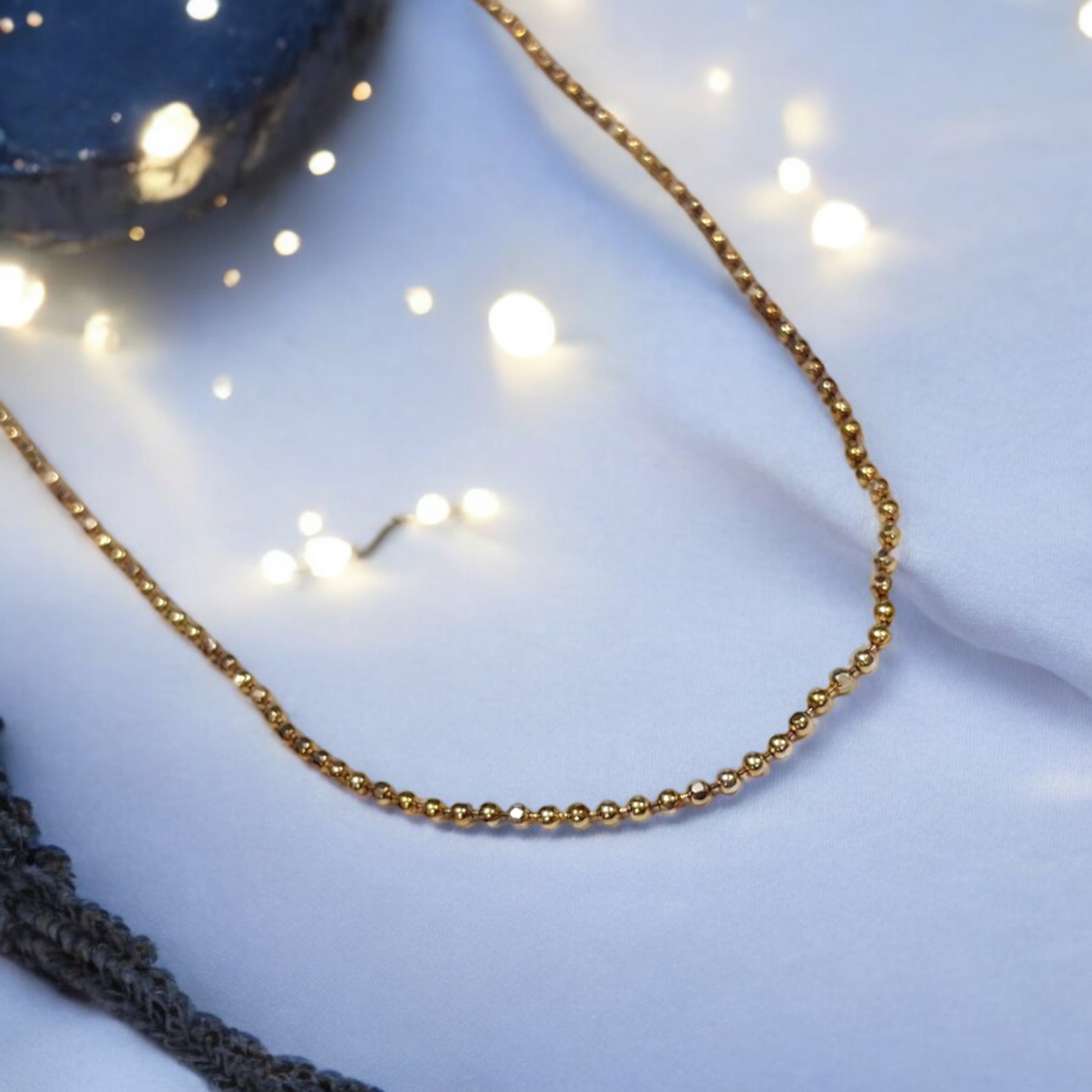 Charming and refined, the Golden Beadline chain features a sequence of delicate, polished beads that create a soft, radiant shimmer along the neckline. Crafted in gold-plated sterling silver, its evenly spaced design adds subtle texture while maintaining a clean, minimalist look. Perfect for effortless styling, this piece brings a touch of warmth and elegance whether worn solo or layered.
