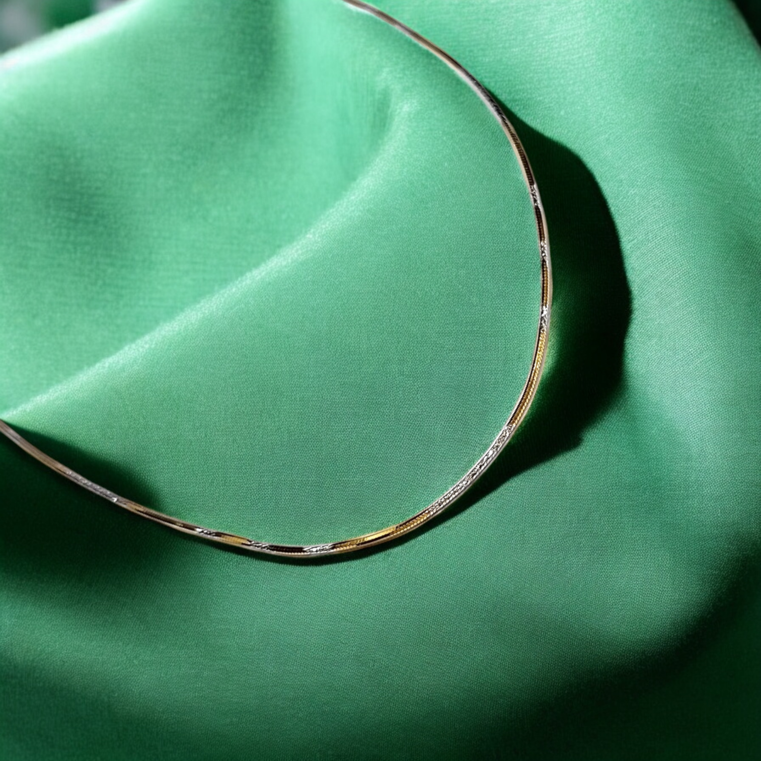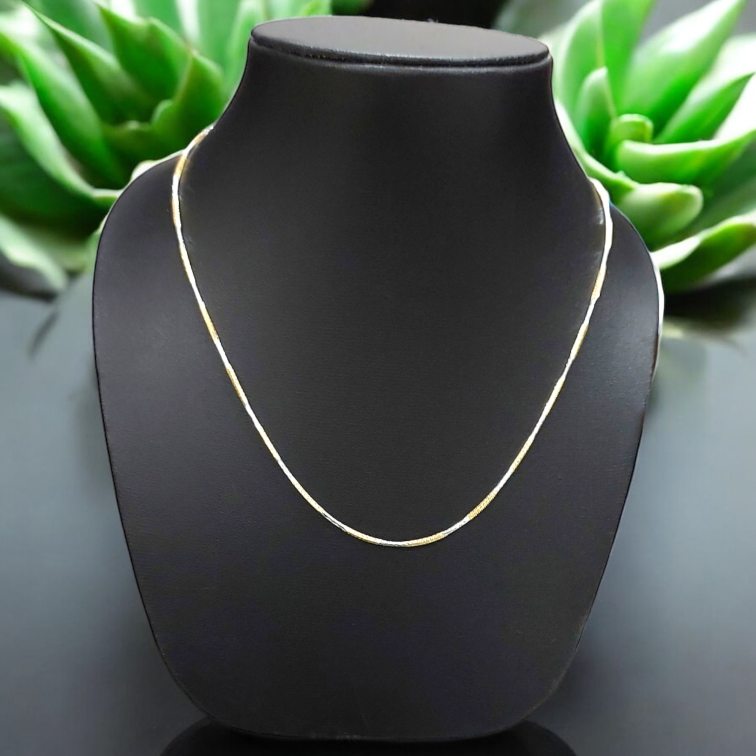 An elegant blend of simplicity and shine, this sterling silver chain is enhanced with a rich gold-plated finish and subtle dual-tone detailing. The smooth, curved form is accented with fine textured sections that reflect light delicately, creating a graceful shimmer. Its clean, modern aesthetic makes it a versatile piece—perfect worn alone for a minimal look or layered for added style.