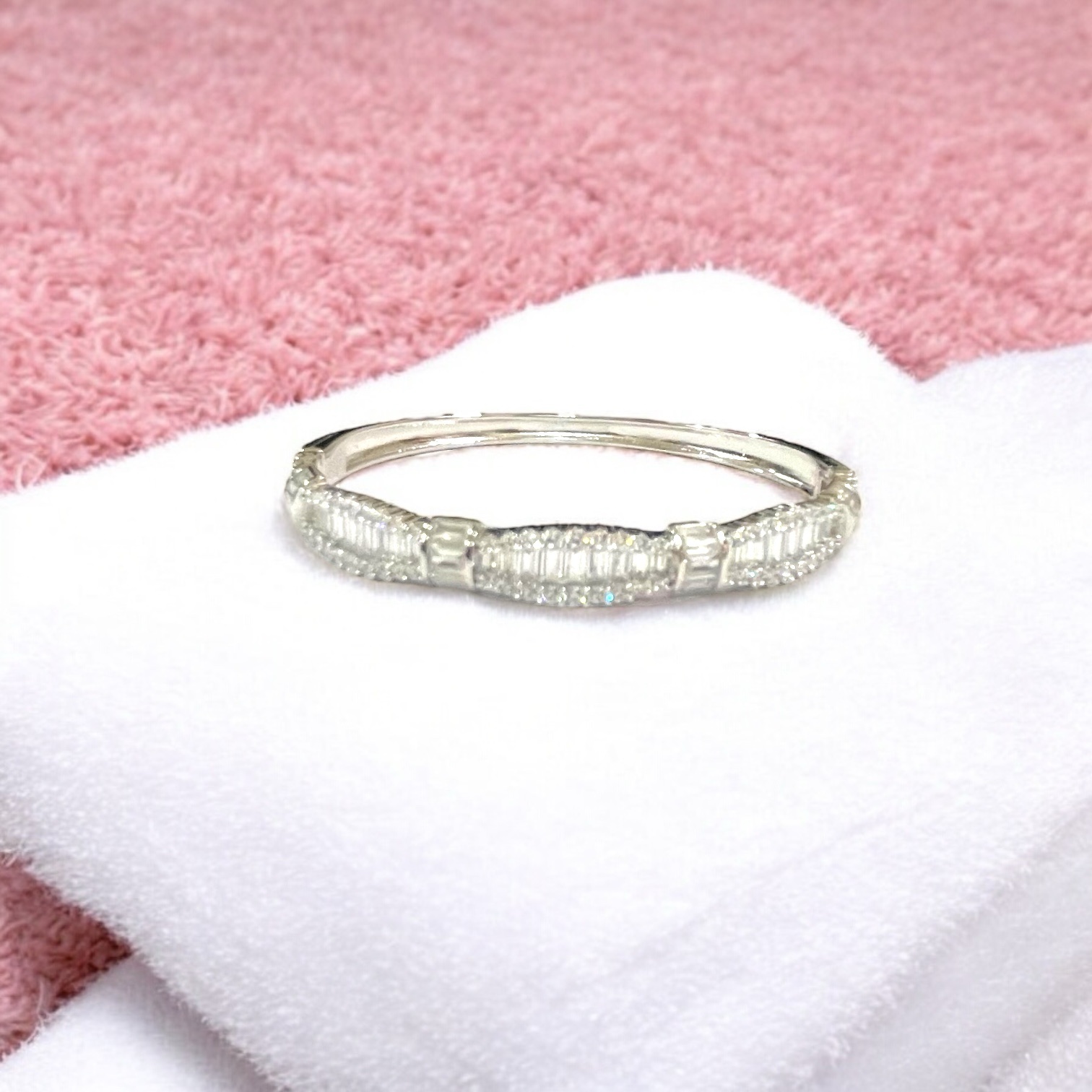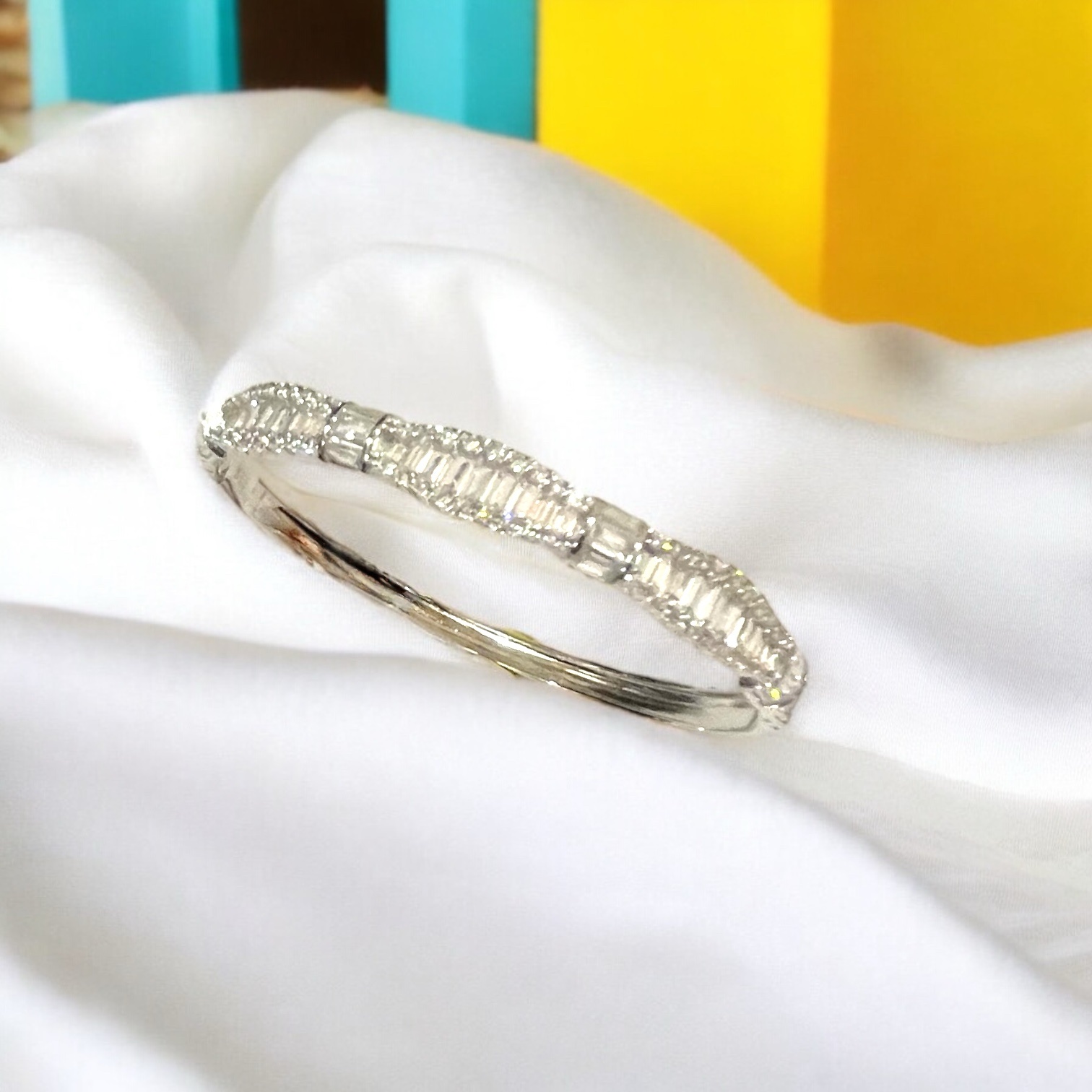 This sterling silver bangle, plated with radiant rhodium, captures timeless luxury in its intricate design. The front is adorned with a series of baguette-inspired rectangular patterns bordered by fine detailing, reflecting light with every movement. Its sleek silhouette and mirror-like polish make it a graceful piece that embodies both modern refinement and classic allure.